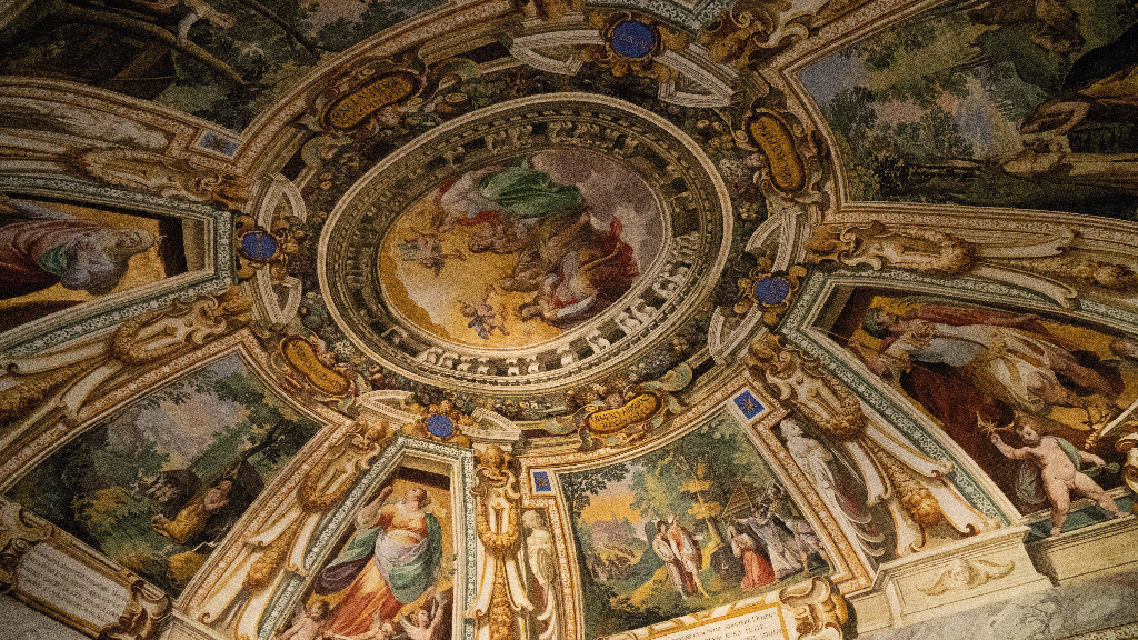 La facciata presenta una doppia scalinata in pietra con un ninfeo a tre nicchioni; all’interno molte sale sono dipinte con figure allegoriche.